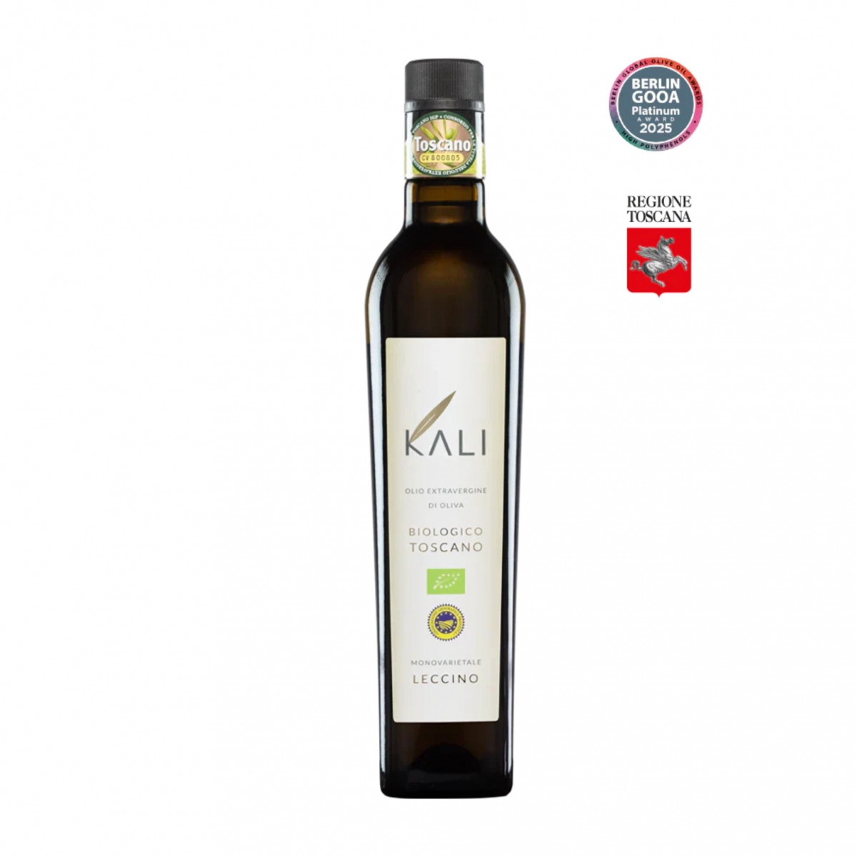 KALI oferuje certyfikowaną ekologiczną oliwę extra virgin Toscano PGI (IGP), wytwarzaną wyłącznie z odmiany Leccino, jednej z najbardziej cenionych odmian toskańskich. Cała plantacja posiada certyfikat BIO, a oliwki uprawiane są bez chemii, w pełni ekologicznie, z poszanowaniem naturalnych procesów rolniczych.