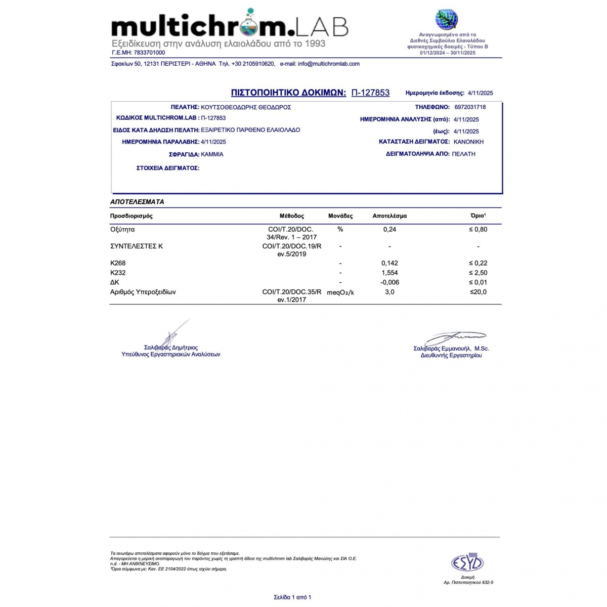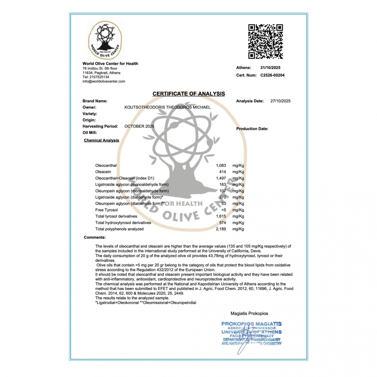 Badania wykonane metodą NMR w World Olive Center for Health potwierdziły, że oliwa należy do światowej czołówki oliw wysokopolifenolowych. Szczególnie wyróżnia ją bardzo wysoki bioaktywny Index D1 – 1497 mg/kg, będący sumą kluczowych fenoli: oleokantalu i oleaceiny.